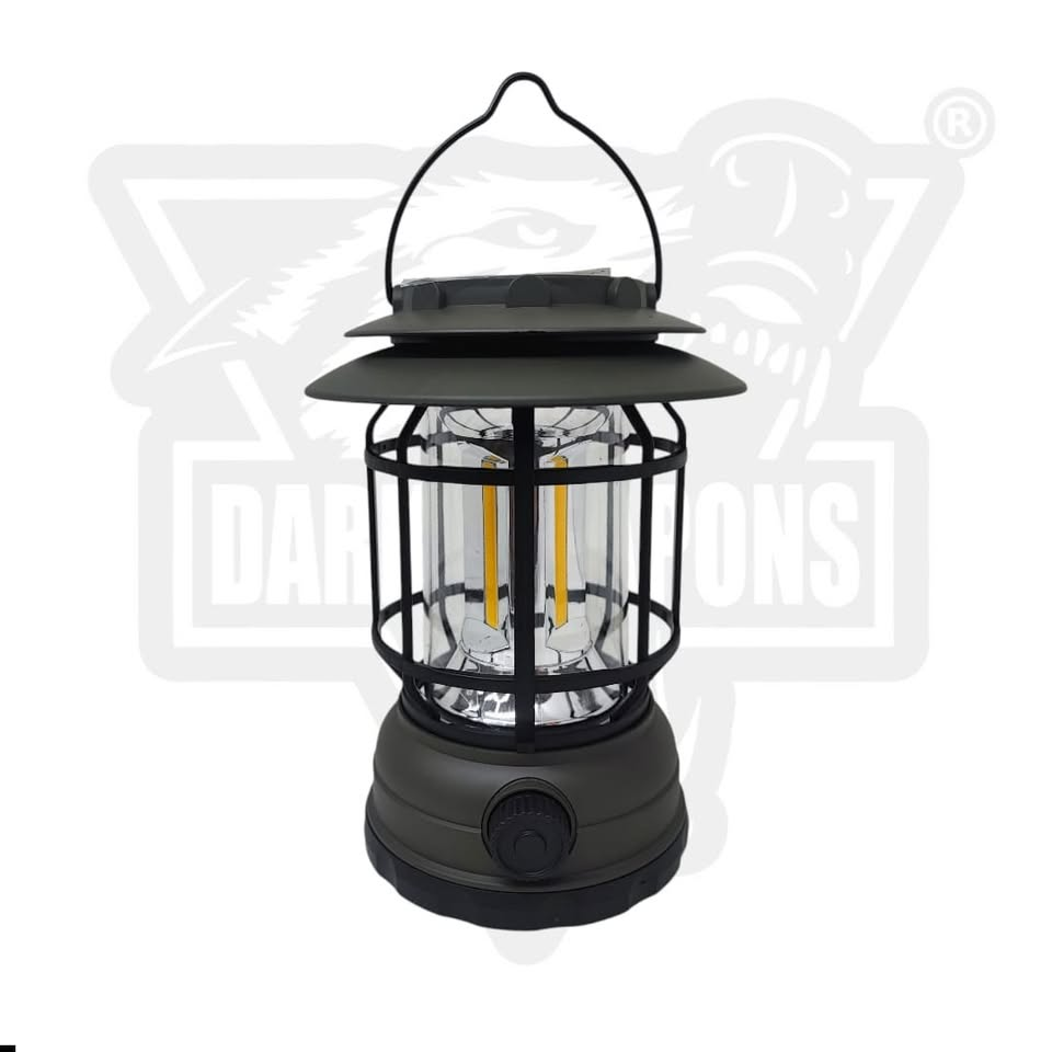 La Lámpara Solar Táctica Retro combina un diseño clásico con tecnología moderna, ideal para campamentos, emergencias o decoración con estilo. Su estructura metálica con acabado resistente le da un aire vintage sin perder funcionalidad. Cuenta con panel solar integrado para cargar durante el día y puerto USB que permite recargar fácilmente la batería o incluso alimentar otros dispositivos. También puedes instalar una batería recargable o usar pilas convencionales, ofreciendo total versatilidad en cualquier situación. Con su luz LED brillante y regulable, podrás ajustar la intensidad según lo necesites: desde una iluminación ambiental suave hasta una luz potente para exteriores